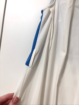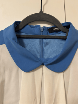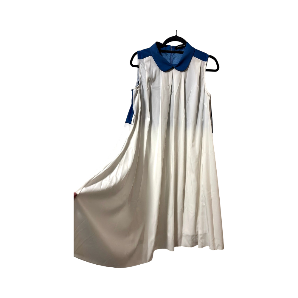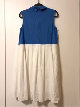 Sleeveless dress with a blue collar. Was bought 8 years ago but never worn. Size 40/L. Belt was not included.