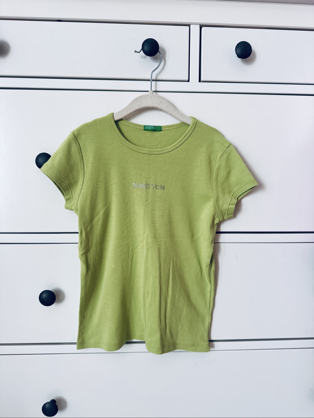 Green short-sleeved Benetton shirt with decorative text on the front.