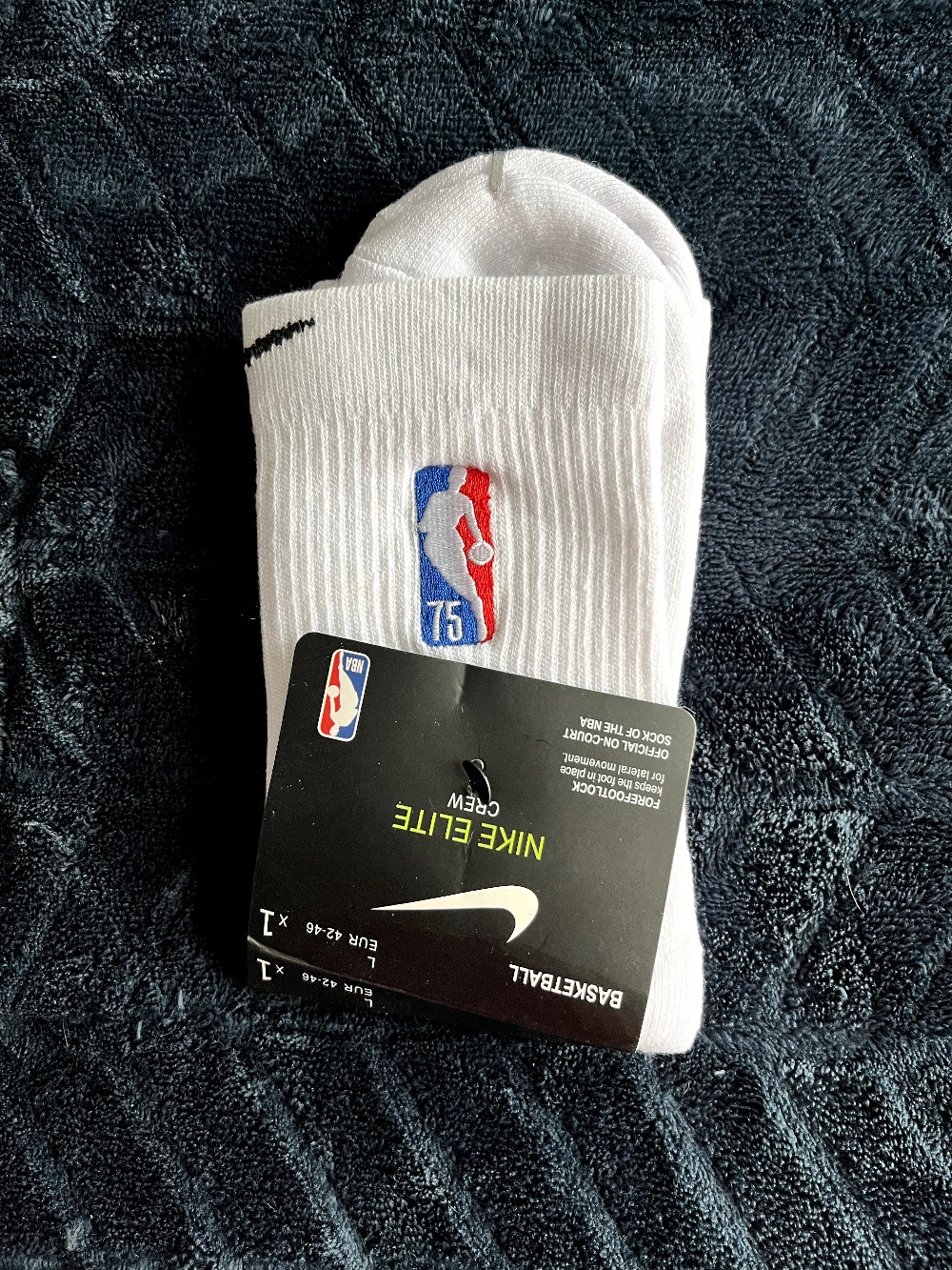 White Nike Elite crew socks with NBA logo detail. Features cushioning and ventilation. Size L, 42-46.