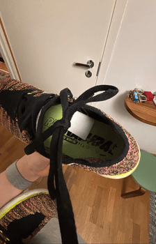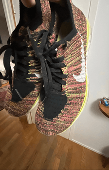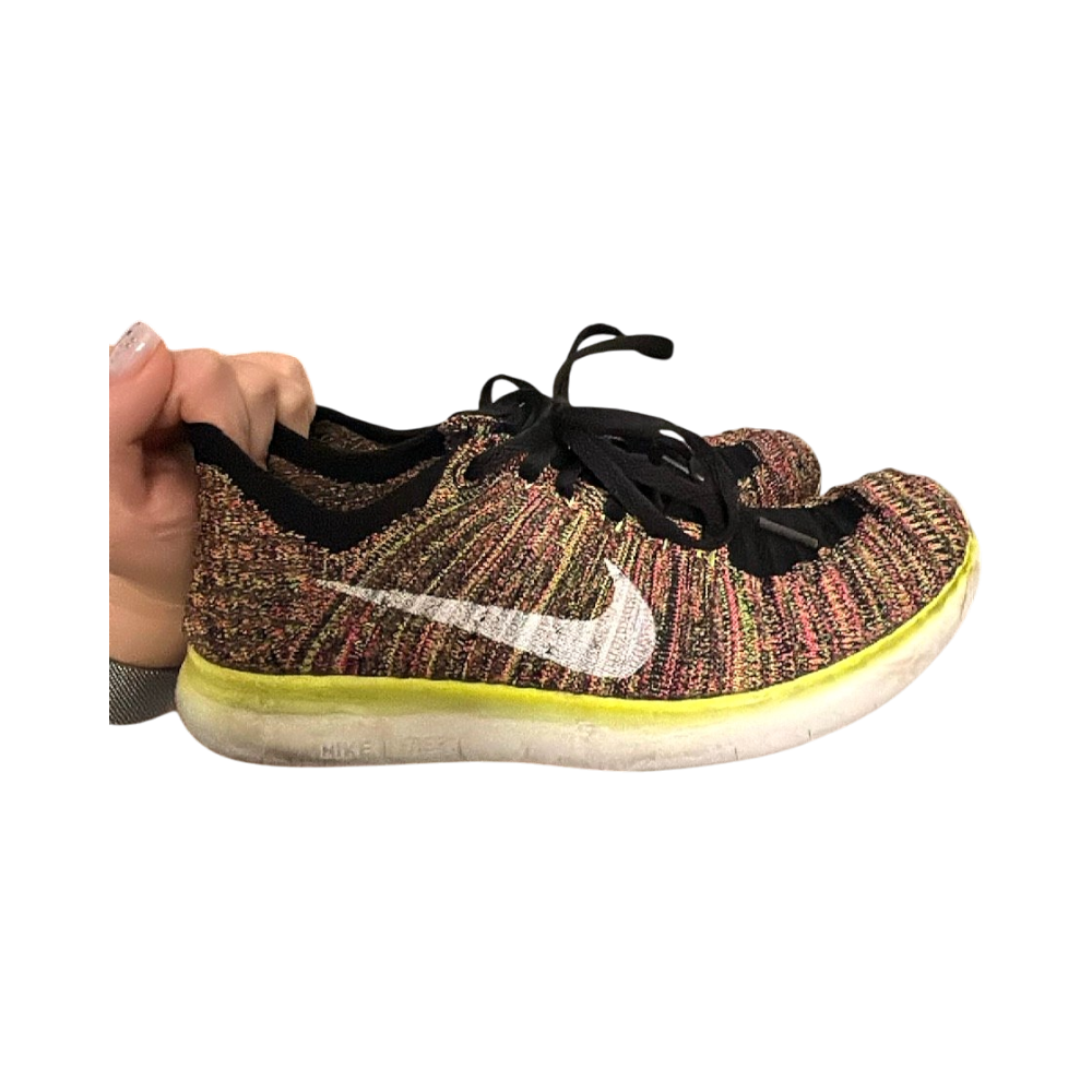 Lightweight running shoes featuring a multicolor knit upper and black accents. Designed for comfort, with a cushioned sole for support during workouts.