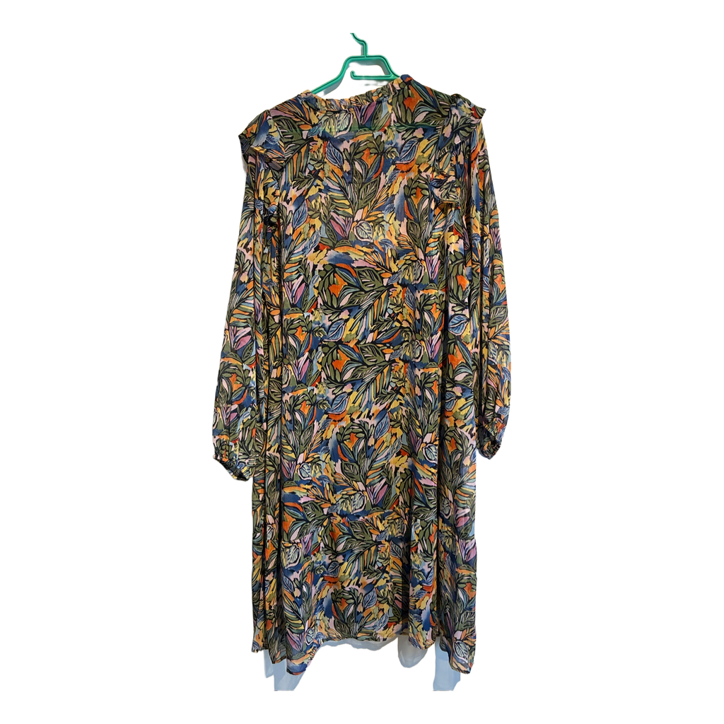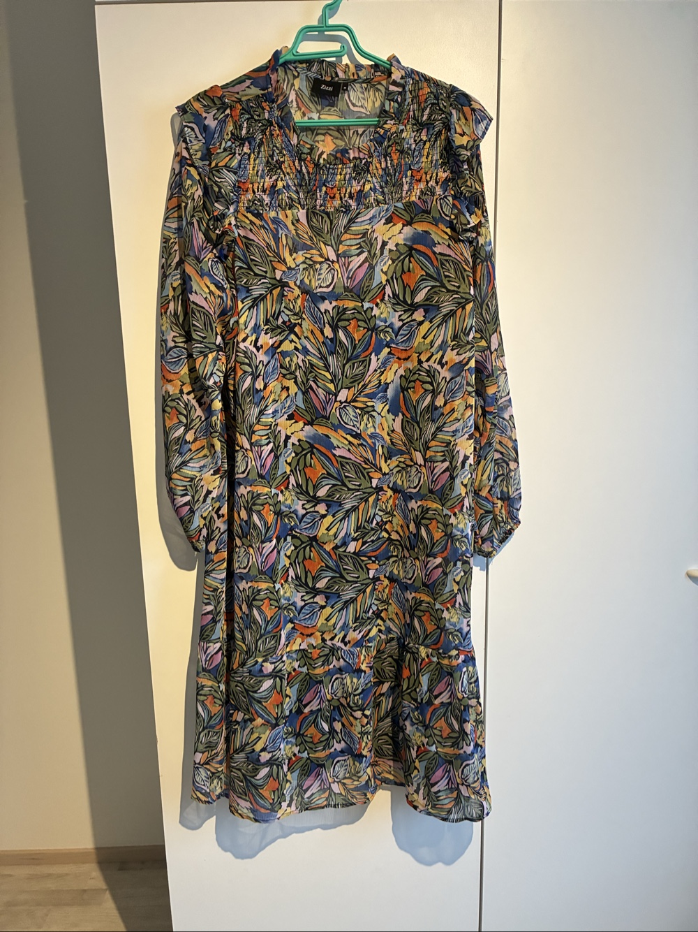 Colorful patterned Zizzi dress. Long-sleeved, with ruched detail at the chest. Size M, slip, shoulder-to-hem 118 cm, underarm-to-underarm 62 cm.
