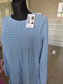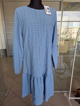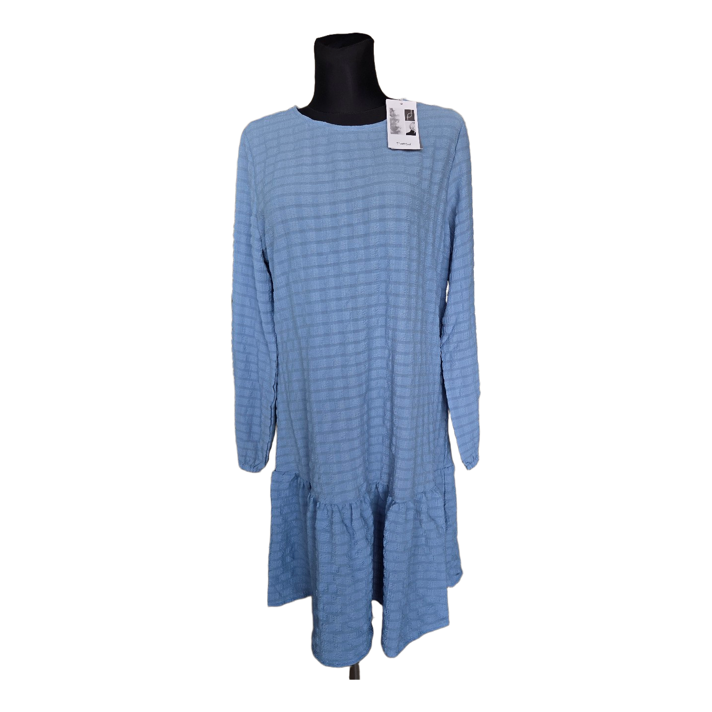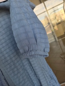 Blue dress with a textured checkered pattern and a ruffle hem. Features long sleeves with elastic cuffs. Size M.