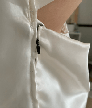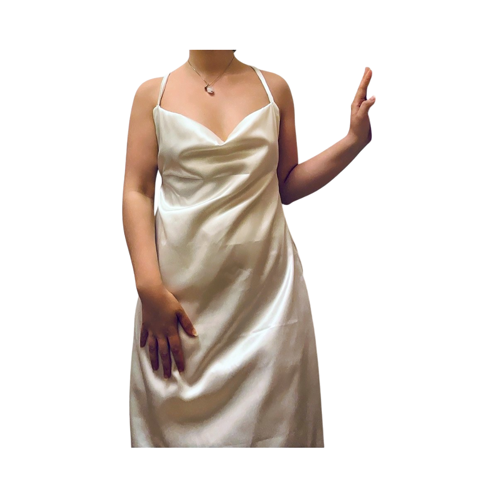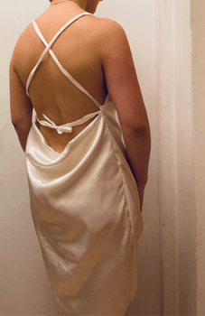 The dress is the first dress I made myself, and the first time I sewed with satin fabric. I made this in a hurry for a party which shows in the workmanship; this is mainly visible when admiring the inside of the dress. From the outside quite neat and works well for other parties too. Double-layered fabric, not see-through. I am size S in the top, bottom M/L and the dress is made to my measurements. The fabric is some kind of synthetic fiber. On the side of the dress, under the armpit, there is a black invisible zipper because I couldn't find a white one at home in a hurry (last picture). Length: on someone 163 cm tall about to the knees / slightly above the knees.