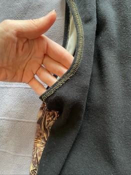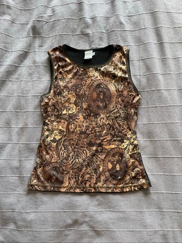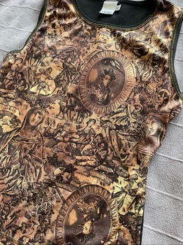 Sleeveless top featuring an ornate historical graphic print on the front. Solid black fabric on the back with contrast stitching.