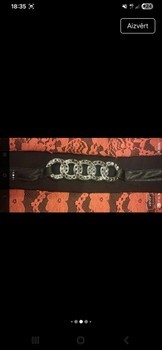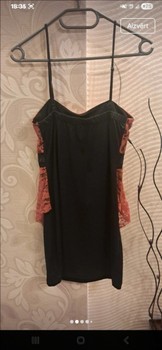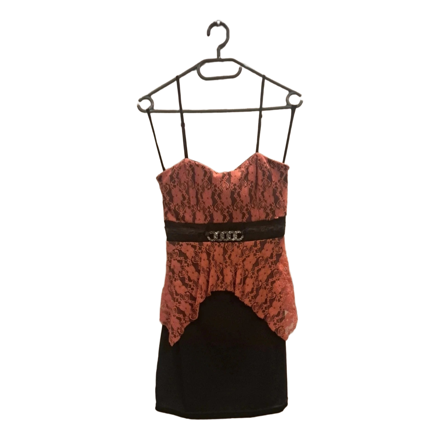 Sleeveless dress with pink lace bodice overlay and black skirt. Features decorative chain-link detail at the waist.