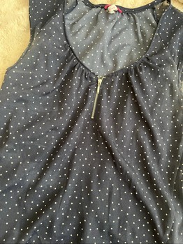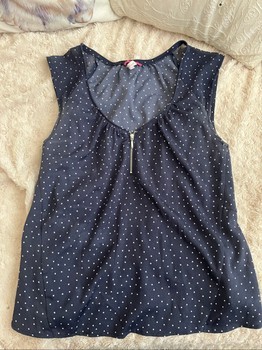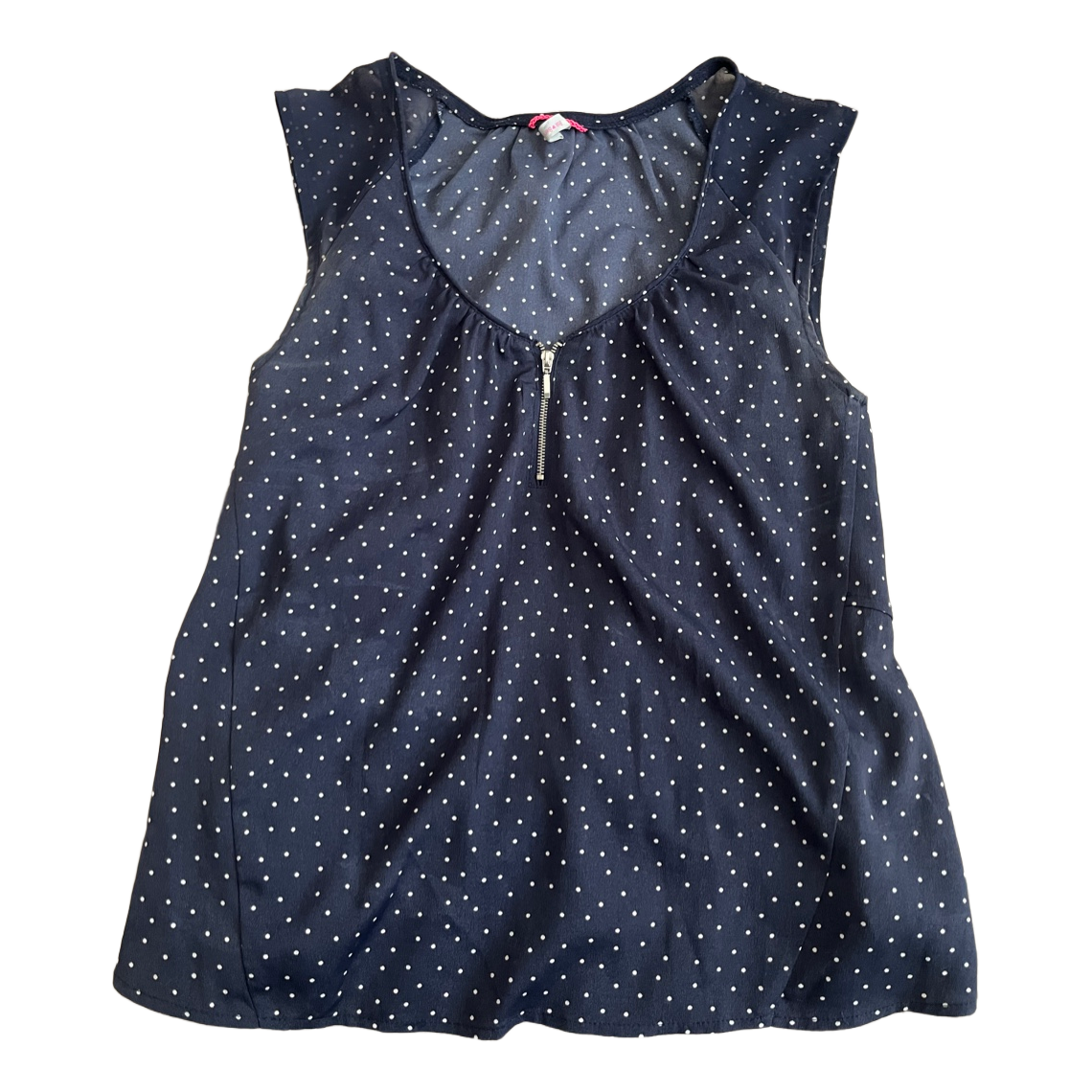 Sleeveless dotted top with zipper detail at the neckline.