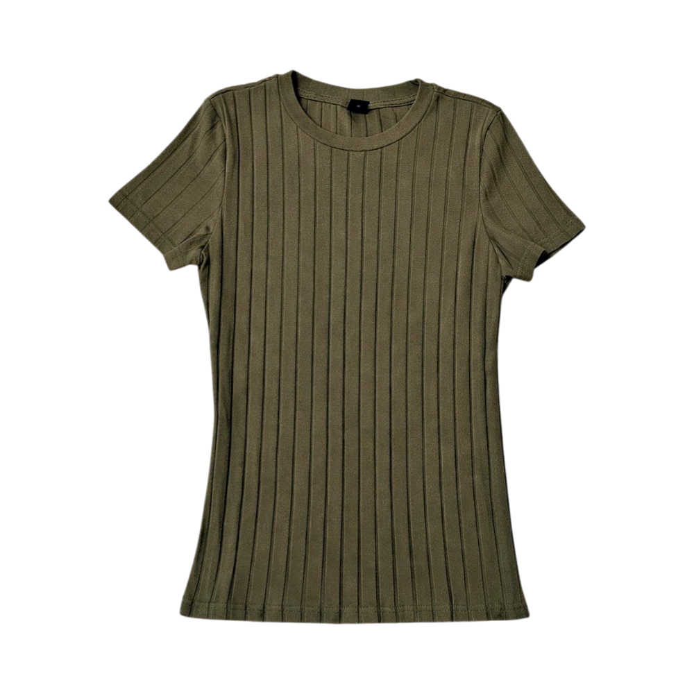 A khaki ribbed short-sleeve top. It features a round neckline and a fitted design.