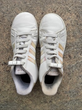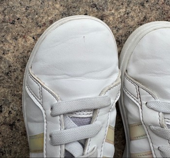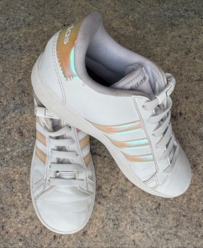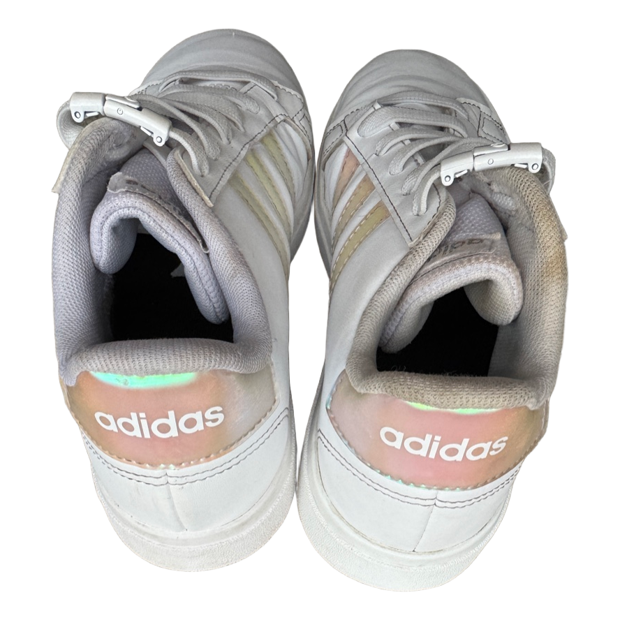 White adidas sneakers with iridescent side stripes and heel detail. Size 35.5.