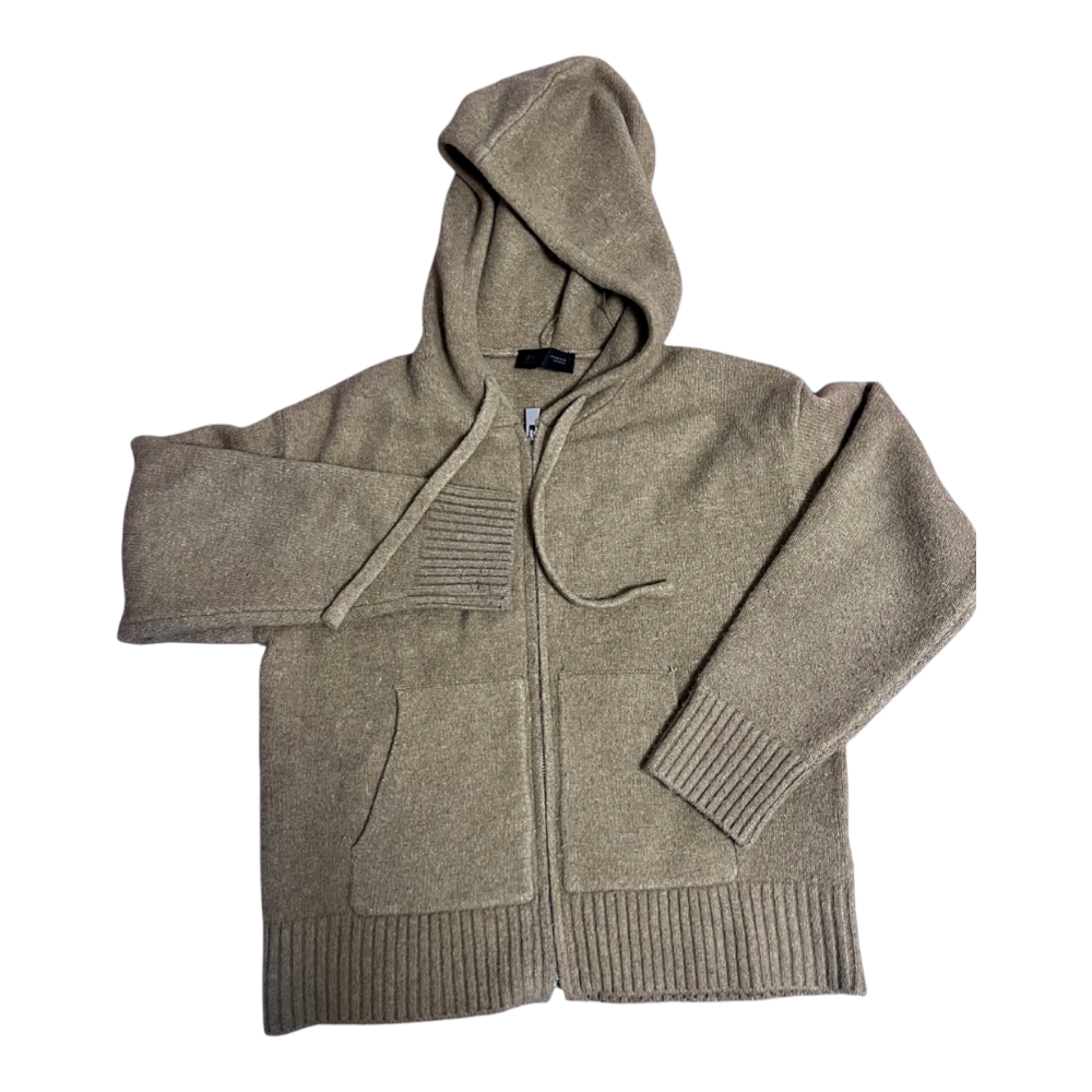 Zip-up hoodie in beige knit fabric. Features a hood with drawstring and ribbed cuffs and hem. Size S.