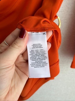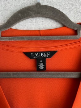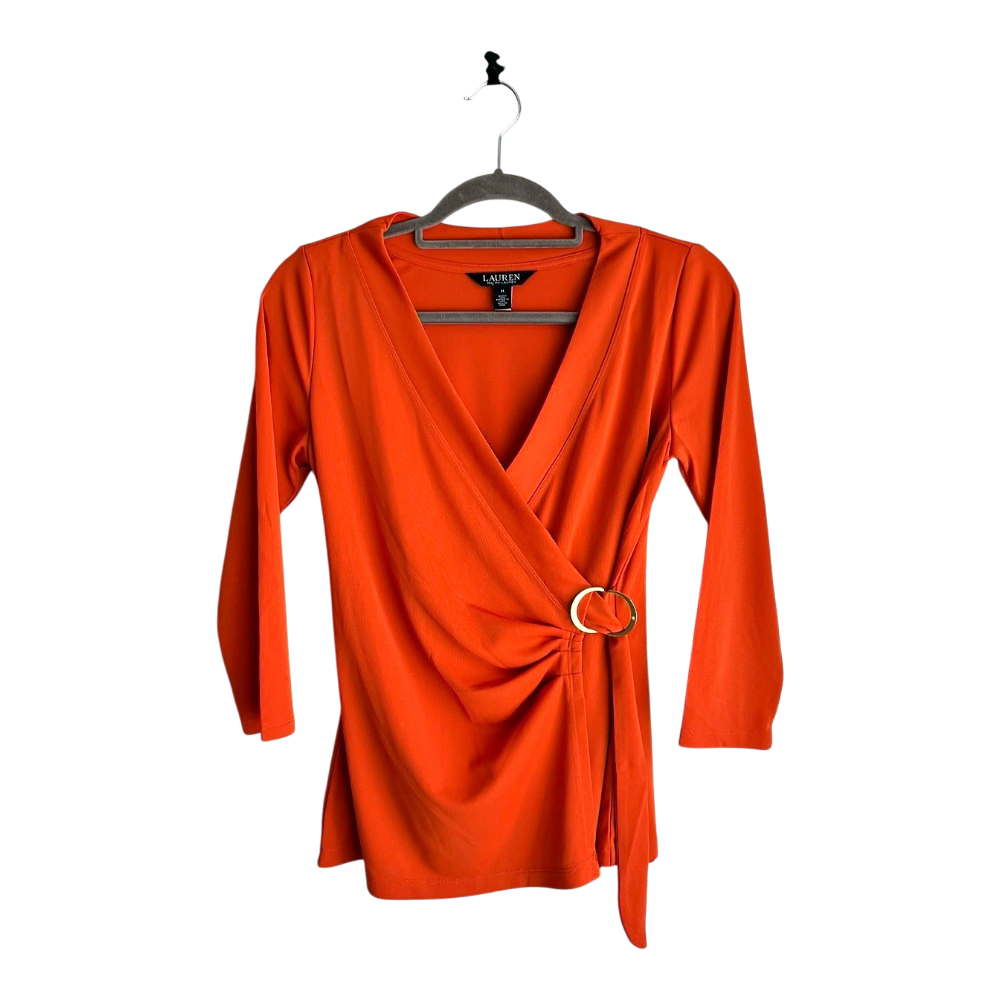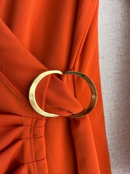 Orange wrap top with a gold-tone side ring detail. Size M.