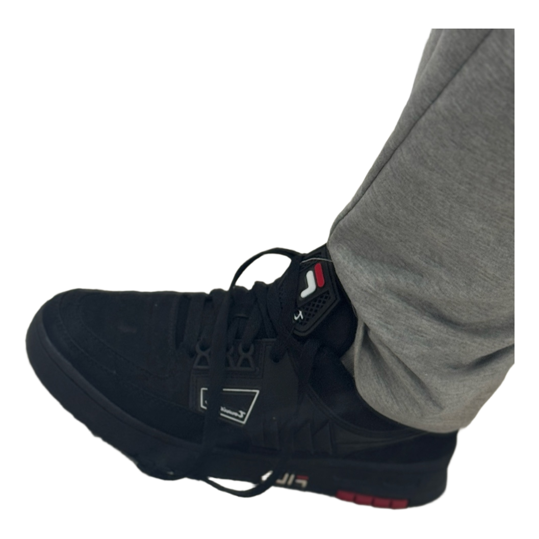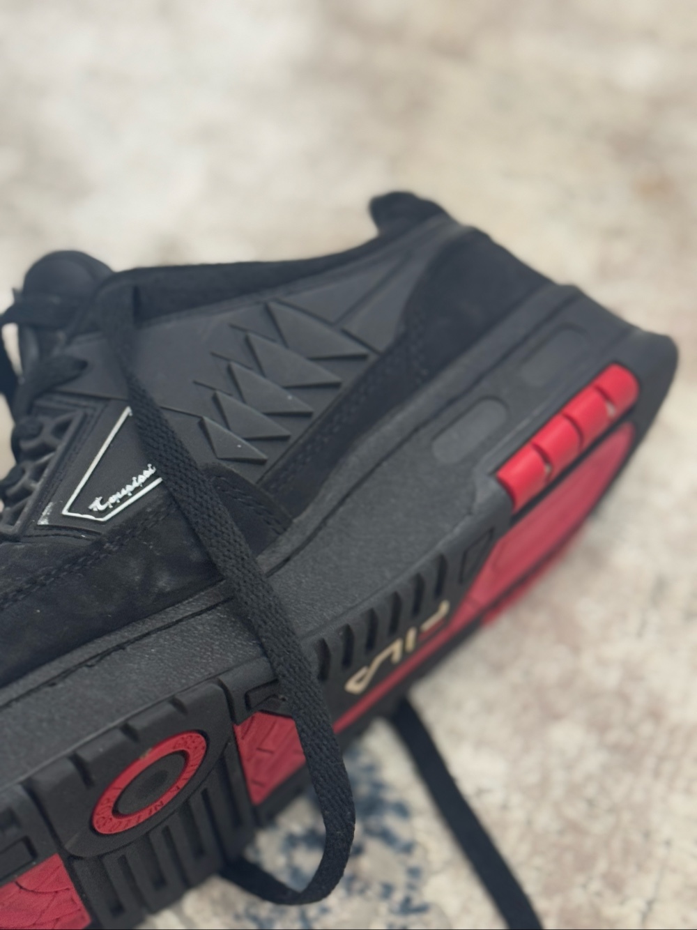 Fila sneakers in black with red sole accents. Features lace-up closure and logo detailing on the side.