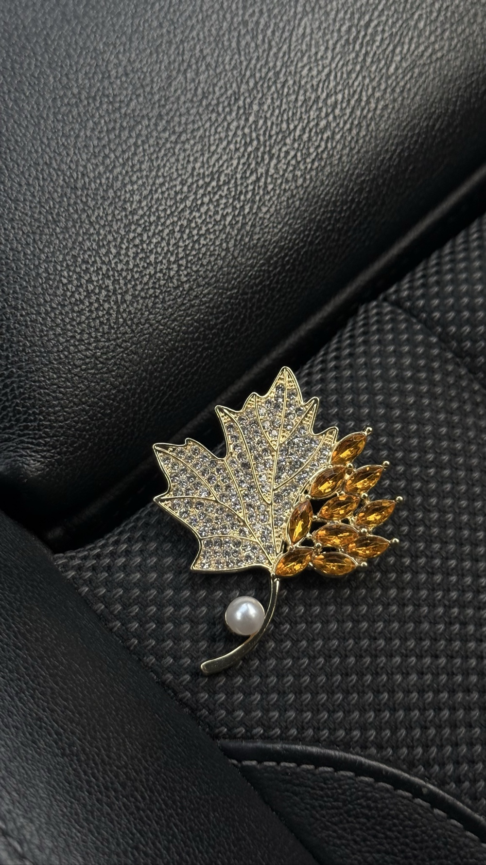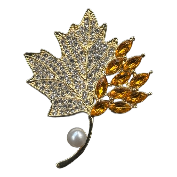 Maple leaf-shaped brooch with decorative crystals and a pearl.