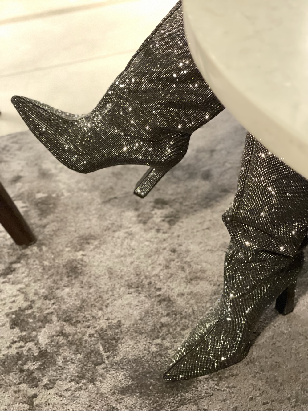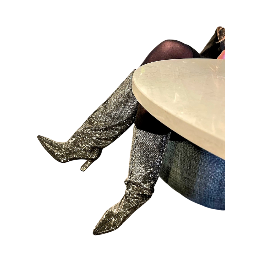 Shiny silver boots with pointed toes and high heel. Suitable for parties or special occasions.