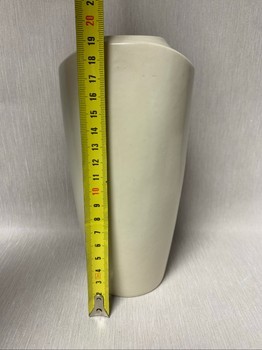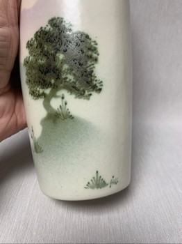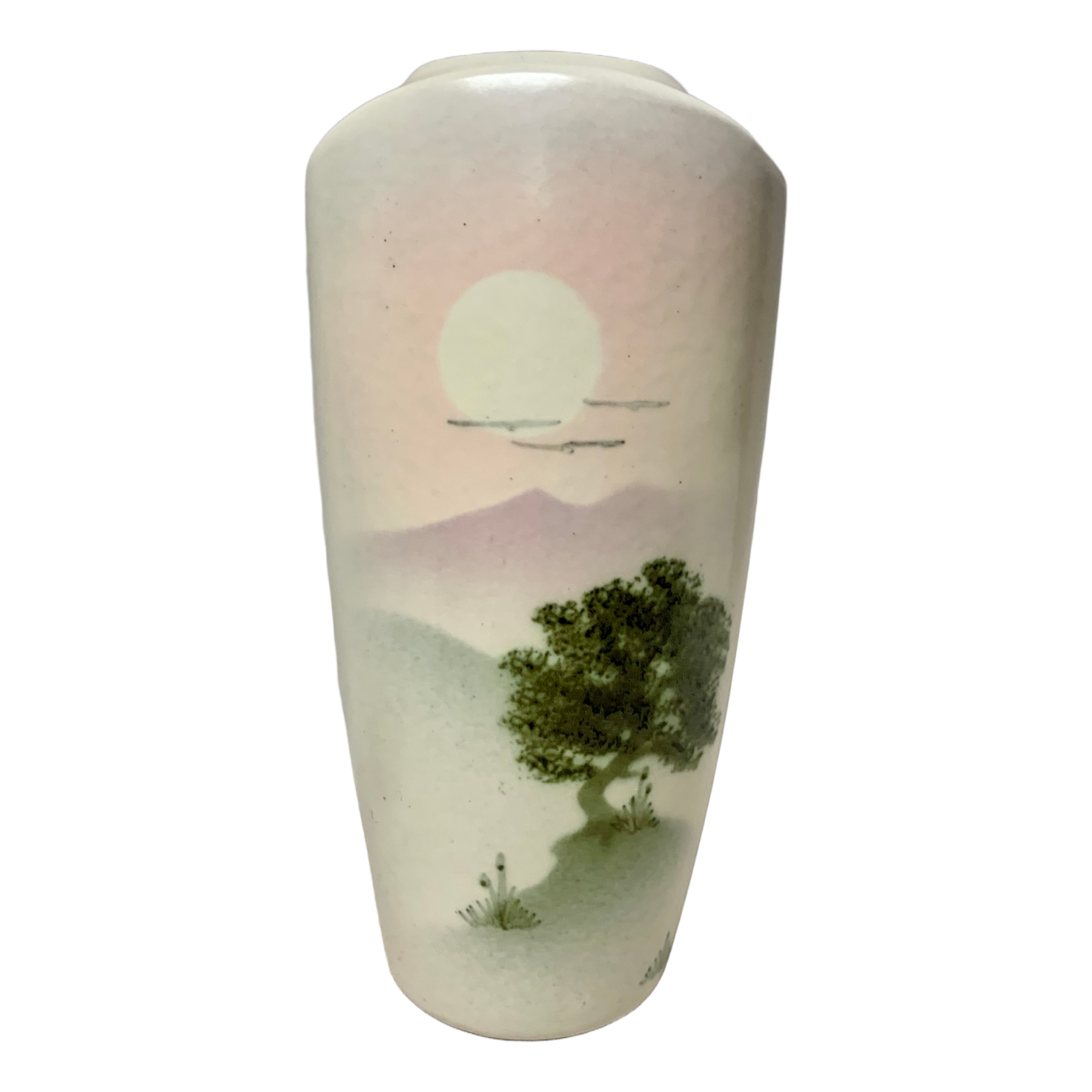 Ceramic vase featuring a hand-painted landscape scene with a tree and sun. Measures approximately 20 cm in height.