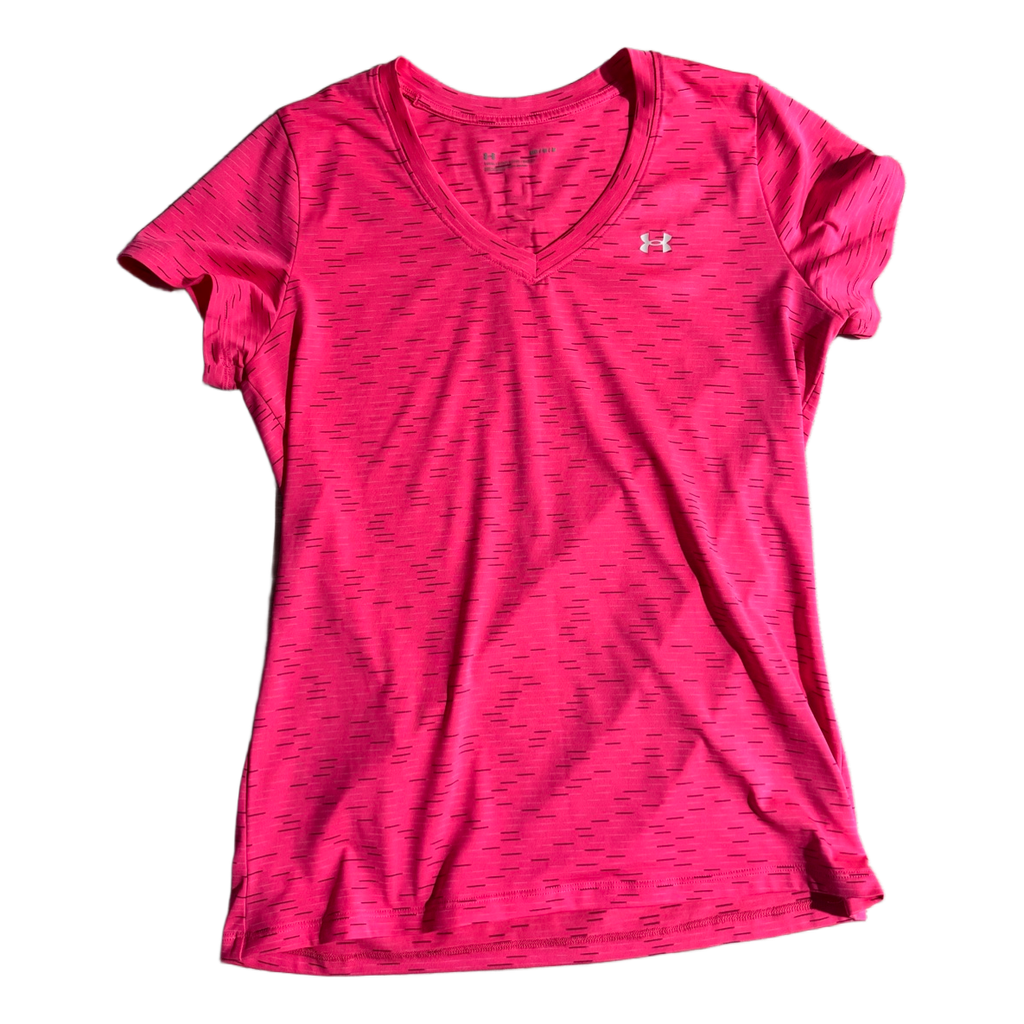 Pink Under Armour v-neck t-shirt with short sleeves and subtle pattern.