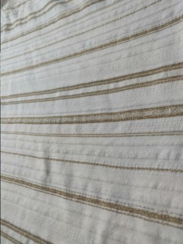 Women's natural white blouse, with gold stripes, boat neckline and 3/4-length sleeves. Light and breathable. Perfect for summer!