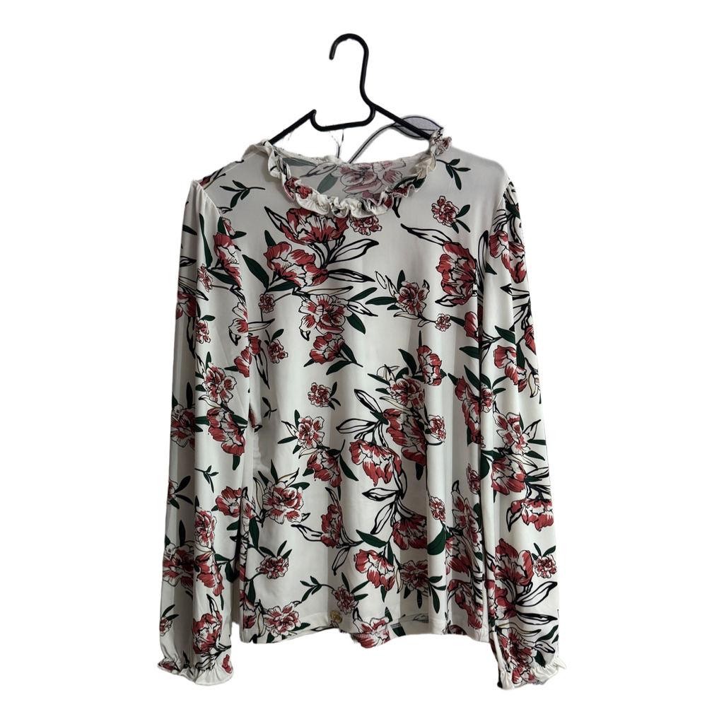 White long-sleeved blouse with a red and green floral pattern. Features a ruffled neckline and cuffs.