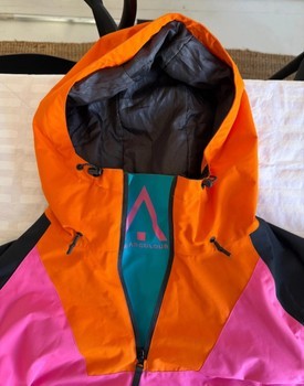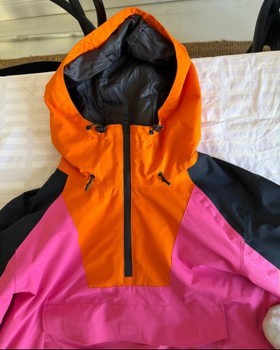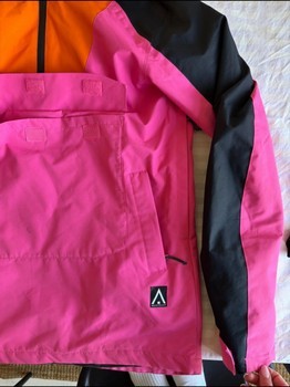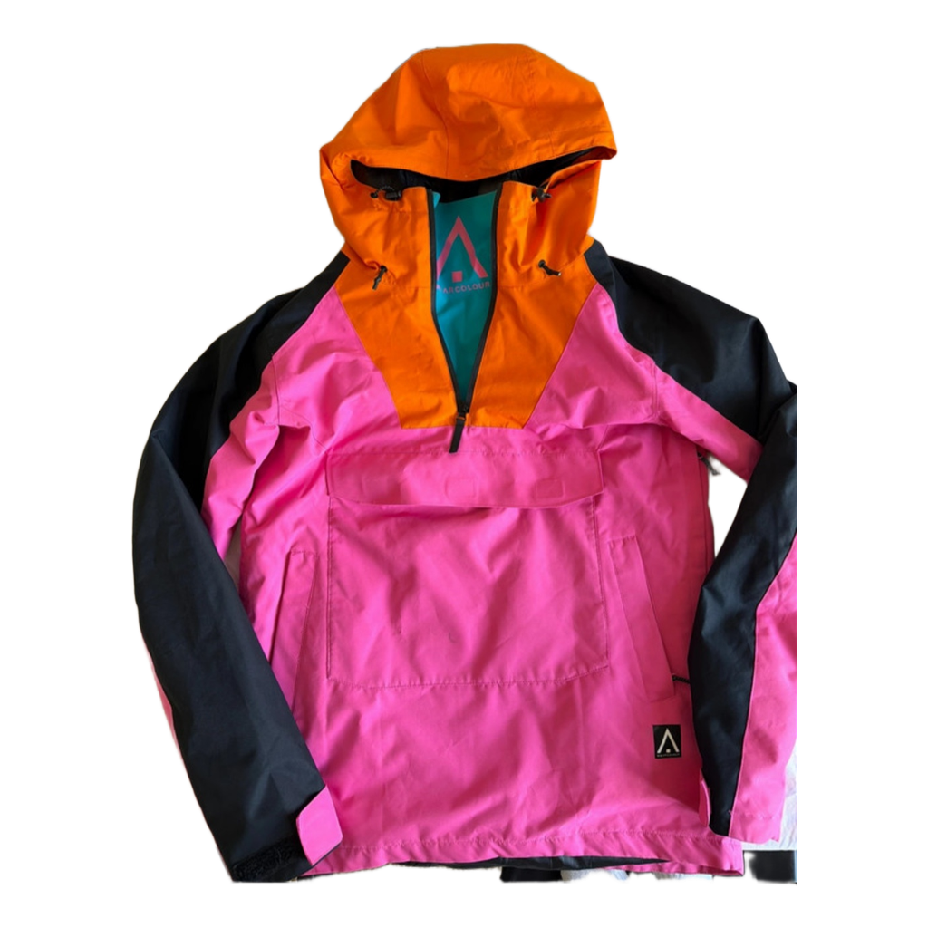 Pullover jacket featuring a hood and a large front pocket. Color-blocked design in pink, orange, and black. Size S.