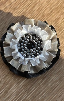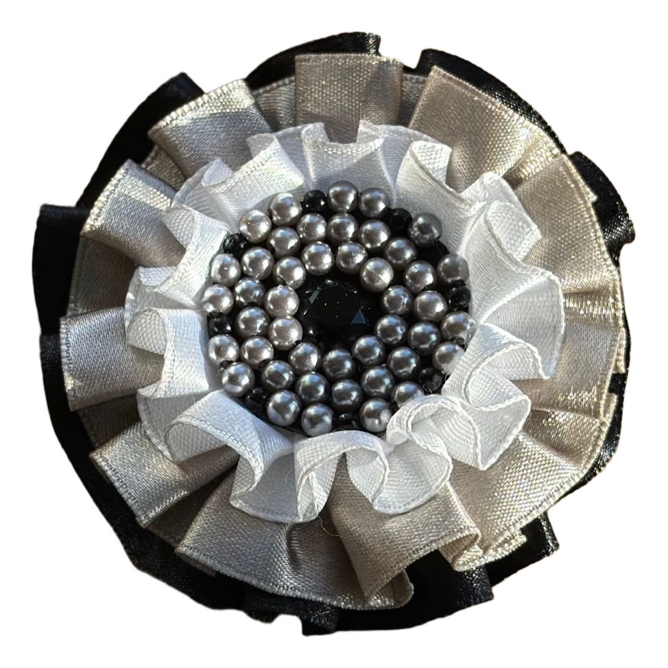 Decorative floral brooch featuring layered satin ruffles in black, white, and silver. Embellished with a center of small grey beads and a central dark stone.