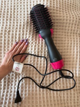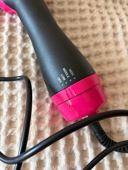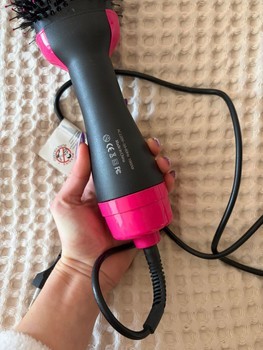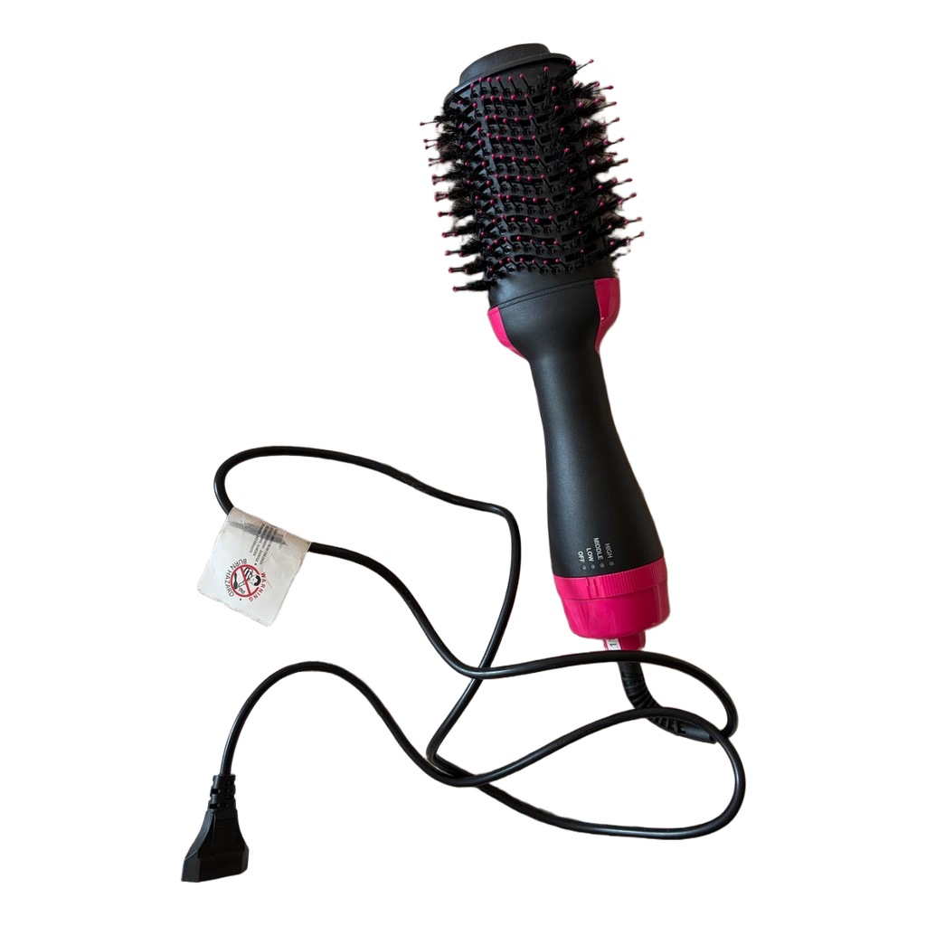Hot air hair styling brush in black and pink. Features multiple heat settings.