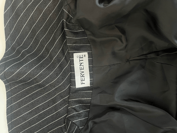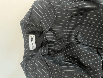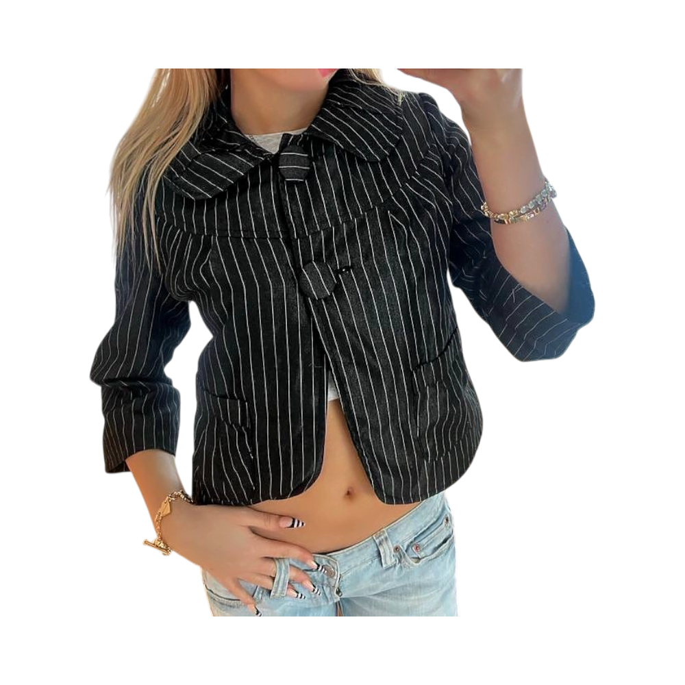 Short striped shirt-jacket with large buttons and a wide collar. Suits the style and the season's fashion.