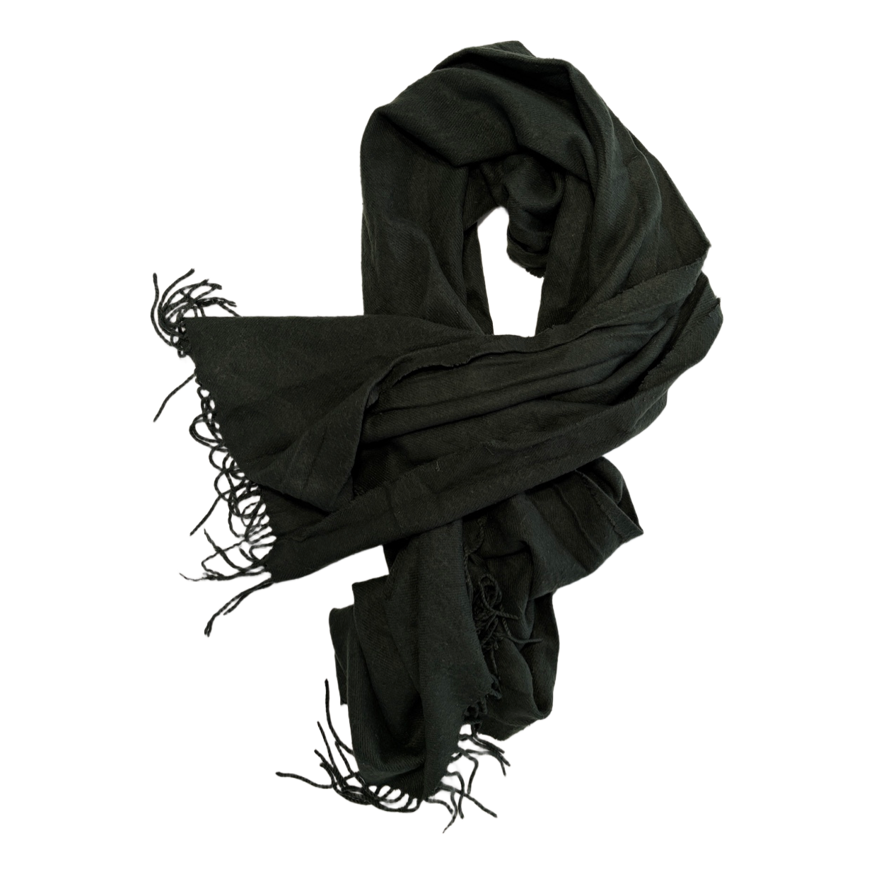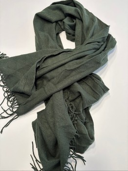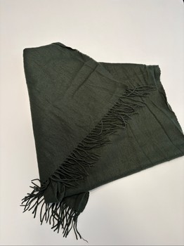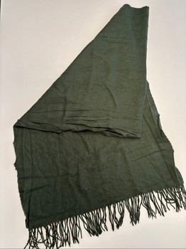 Green neck scarf. The scarf has tassels at the ends. Width approx. 60 cm and length approx. 180 cm. Used. Also slightly pilled. In the pictures there are two close-up photos showing the pilling. Intact and clean, and overall appearance neat.