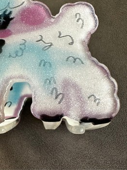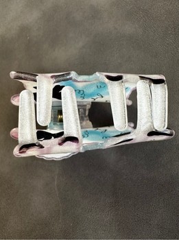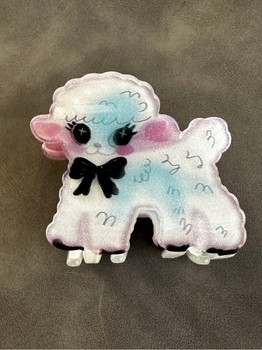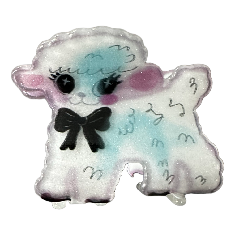 Glittery hair claw clip in the shape of a lamb with a black bow. Features blue and white detailing.