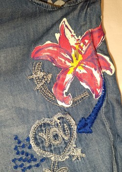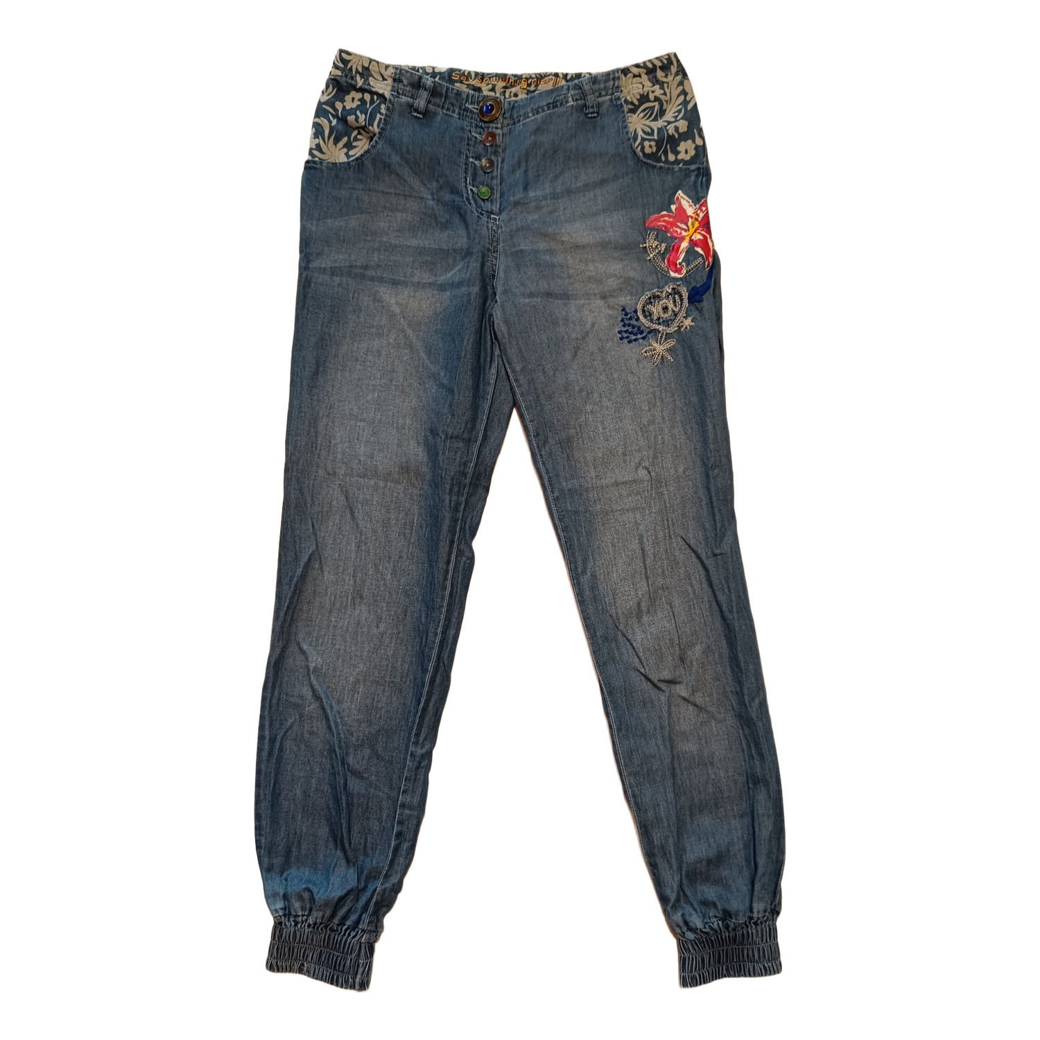 Blue denim trousers featuring floral embroidery and patch details. Elasticated cuffs at the bottom. Size 24.