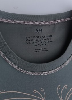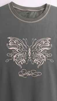 Green t-shirt with a butterfly pattern and text on the front. Size 158/164.
