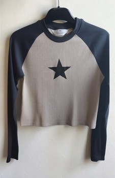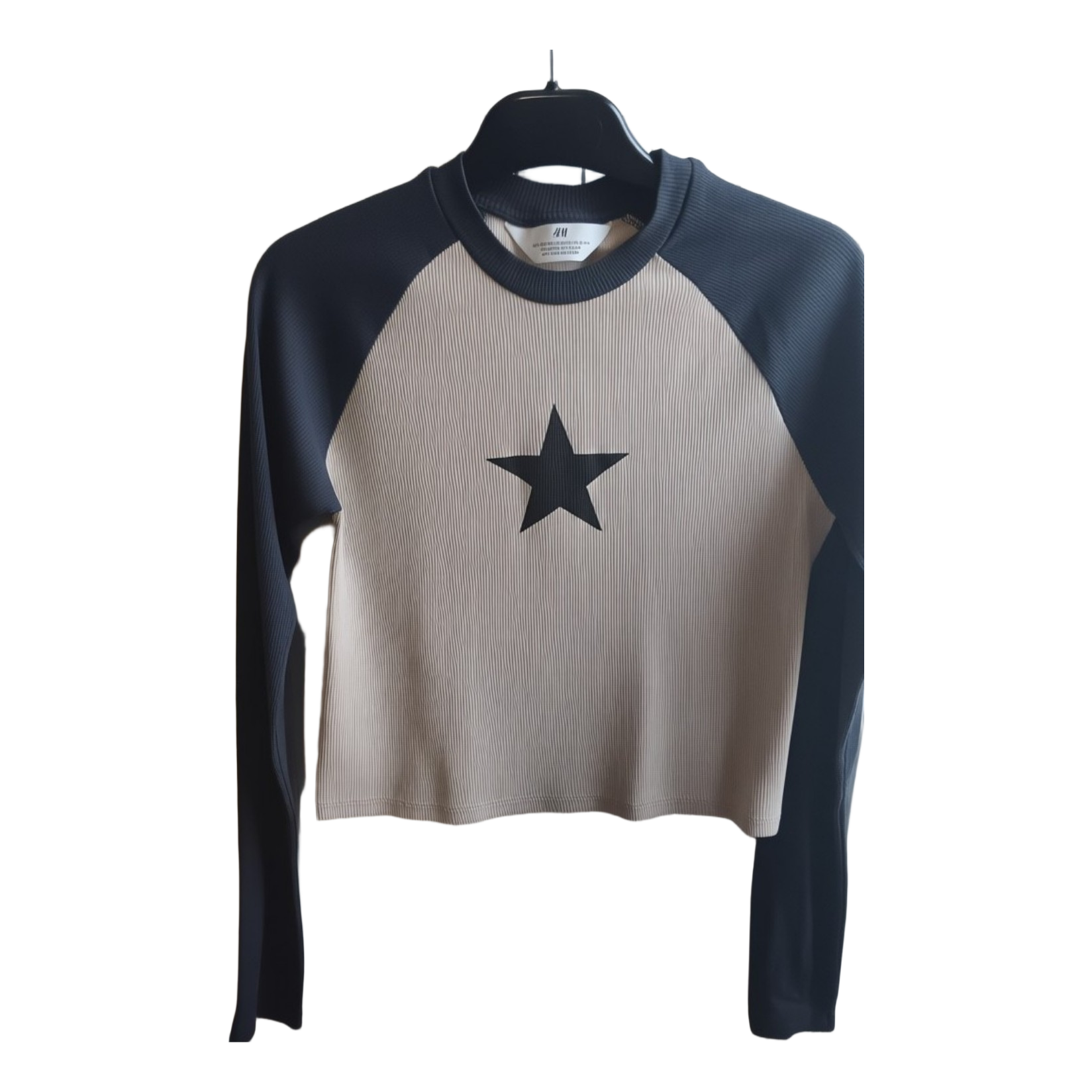 Beige ribbed long-sleeve shirt with a black star and black sleeves. Size 158 cm