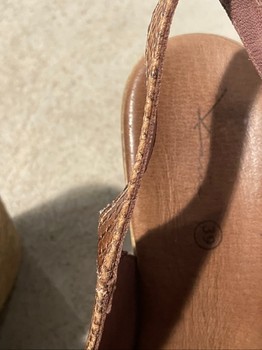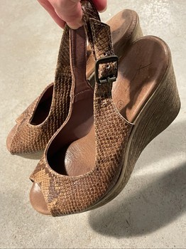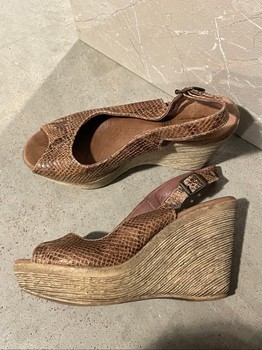 Brown wedge sandals with a snakeskin pattern and peep-toe design. Adjustable buckle strap. Size 39.