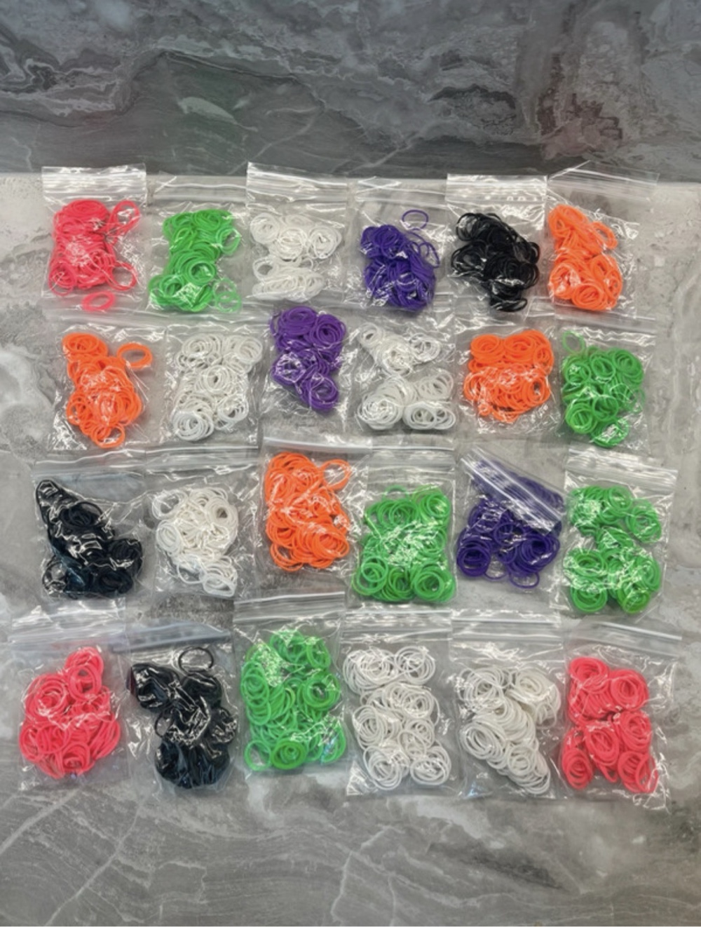 Collection of colorful loom bands in individual plastic bags. Ideal for bracelet making. All for 4 €