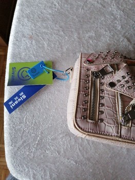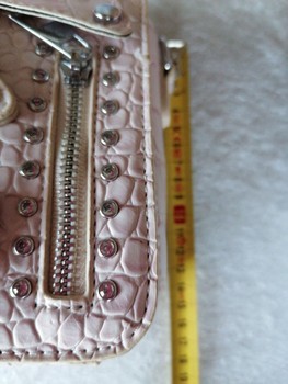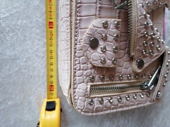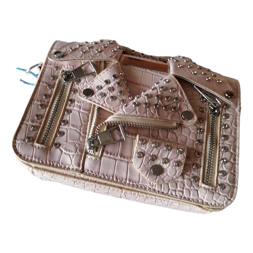 Light pink faux leather bag with crocodile pattern and stud decorations. Detachable strap is included.