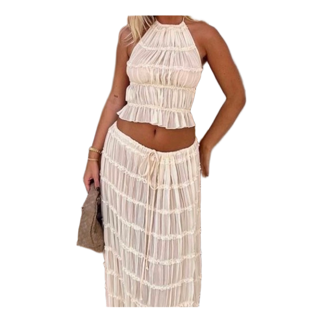 Light-colored, ruffled sleeveless top and matching long skirt. Lightweight summery outfit.