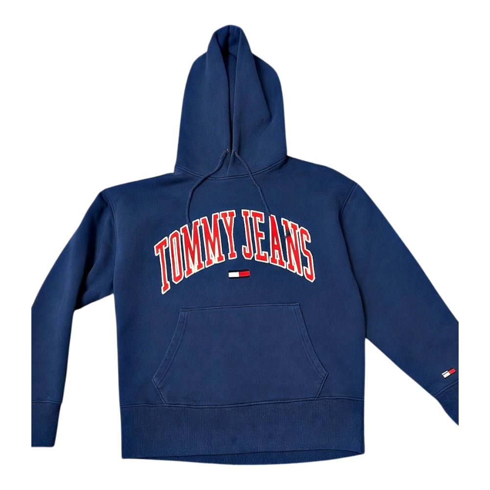 Blue hoodie with Tommy Jeans logo on the chest. Features a front kangaroo pocket and drawstring hood.