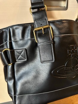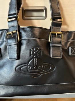 Black handbag with Vivienne Westwood logo on the front. The bag has brass-colored buckle details and a white quilting detail.