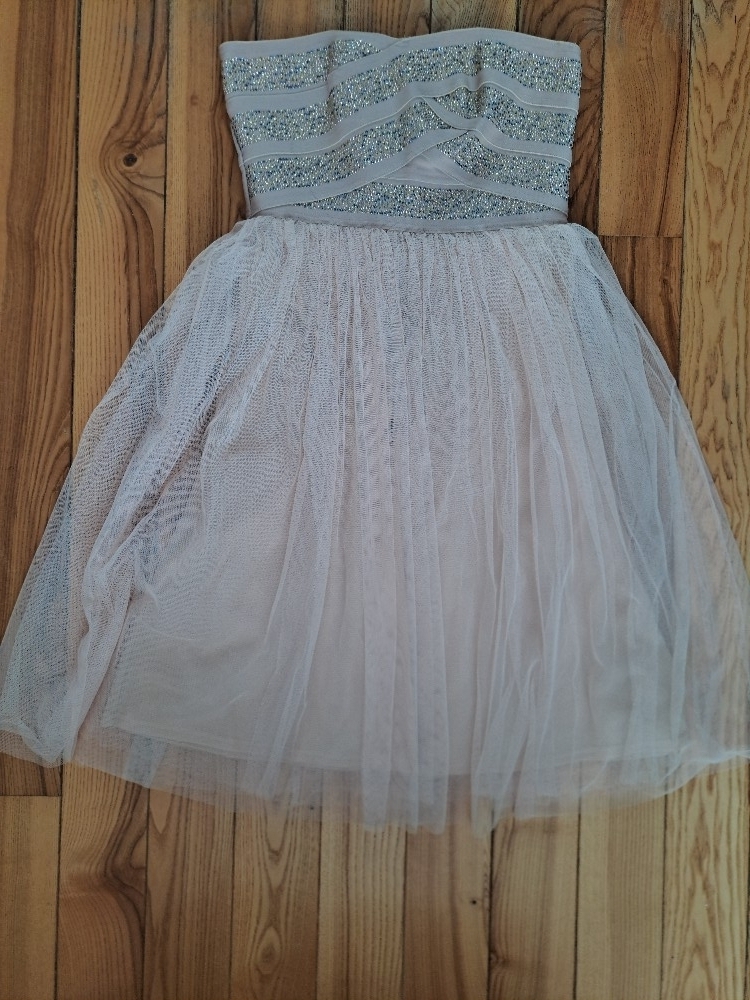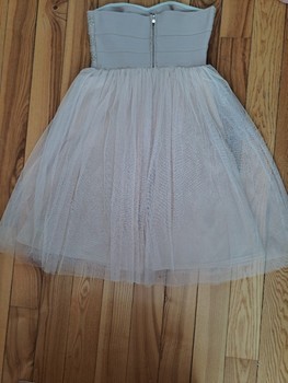 Beige tulle dress with embellished bodice. Zip closure on the back. Size 14.
