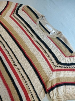 Beautiful and classic lightweight short-sleeved knit sweater. The sweater has a gorgeous multicolored stripe pattern that combines different textures. The sweater has thin shoulder pads to add structure and an authentic retro look.