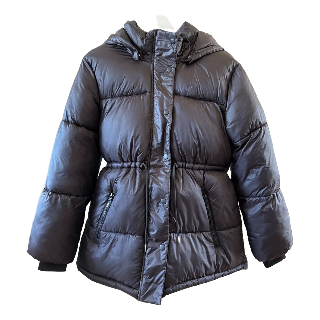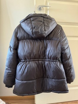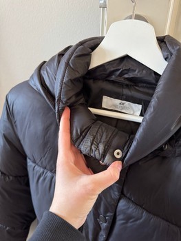 H&M black padded jacket. Size 158, also fits XS. Slight makeup on the collar, will most likely come off in washing. Reflector removed from the back, which left a very small mark (photo 5), but not noticeable in use, only visible when viewed closely.