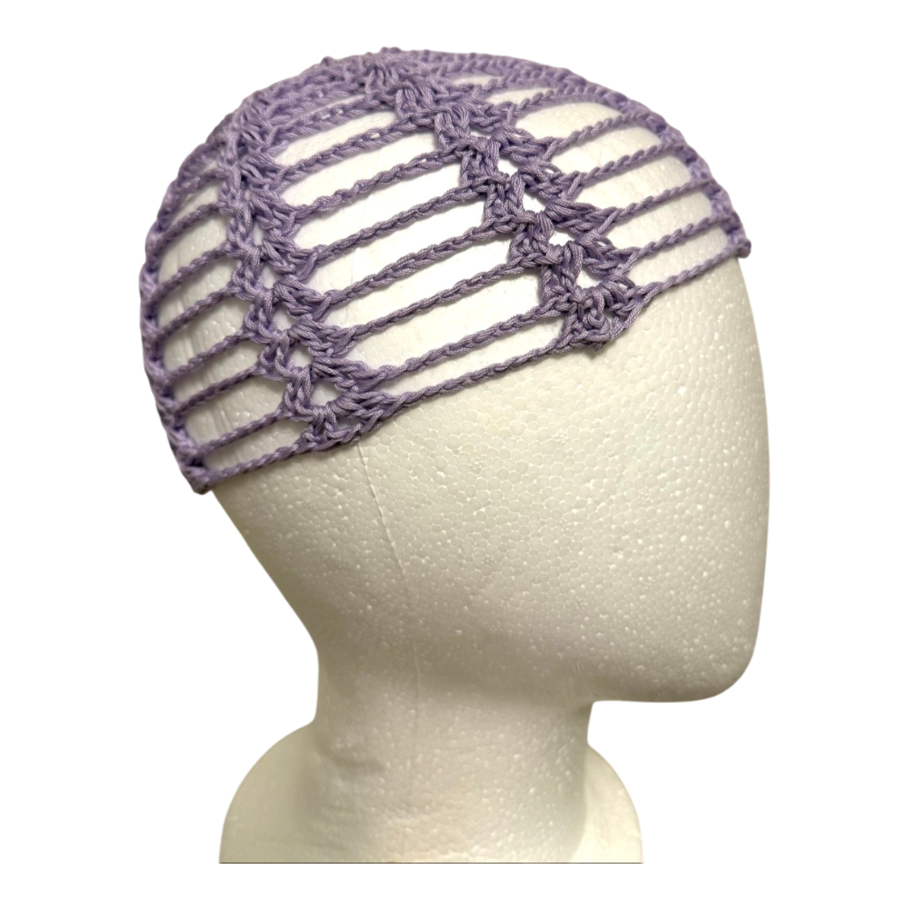 Hand-crocheted, mesh-patterned purple cap / beanie. Adult size.