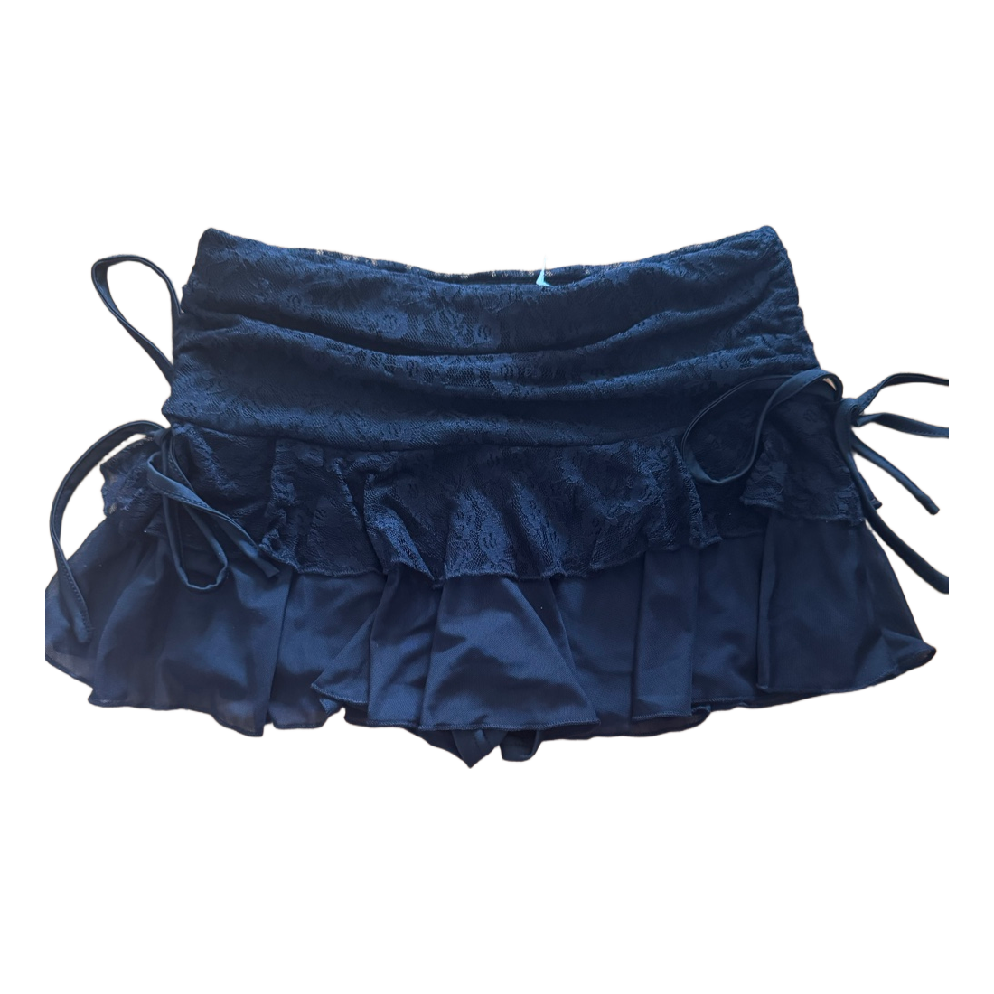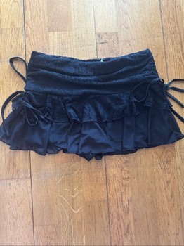 Black mini skirt with layered lace and drawstrings at the sides.