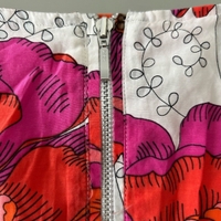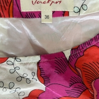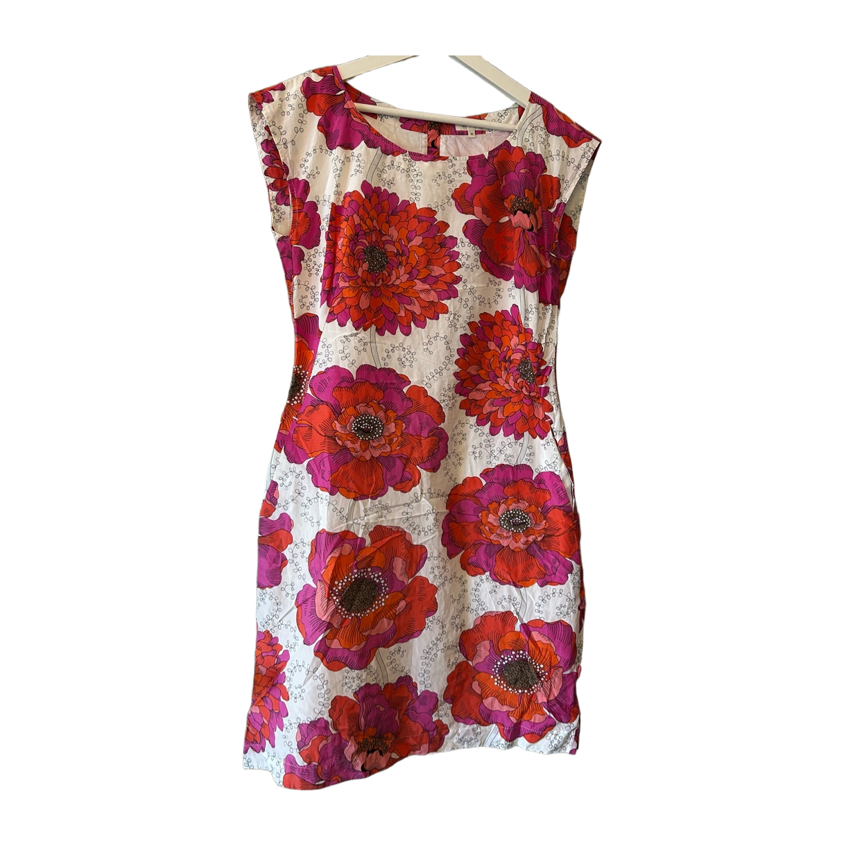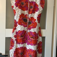 Kaunis mekko kukkakuvioilla. Pyöreä pääntie. Olkapäät auringolta suojassa. Hihaton. Kapeampi vyötäröstä. Helma levenee alaspäin. Taskut sivuissa. Vetoketju takana. Vuorellinen. Alushame 100% asetaattia. Uudenveroinen. Vesipestävä 30C.