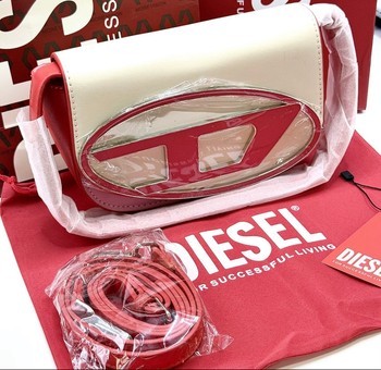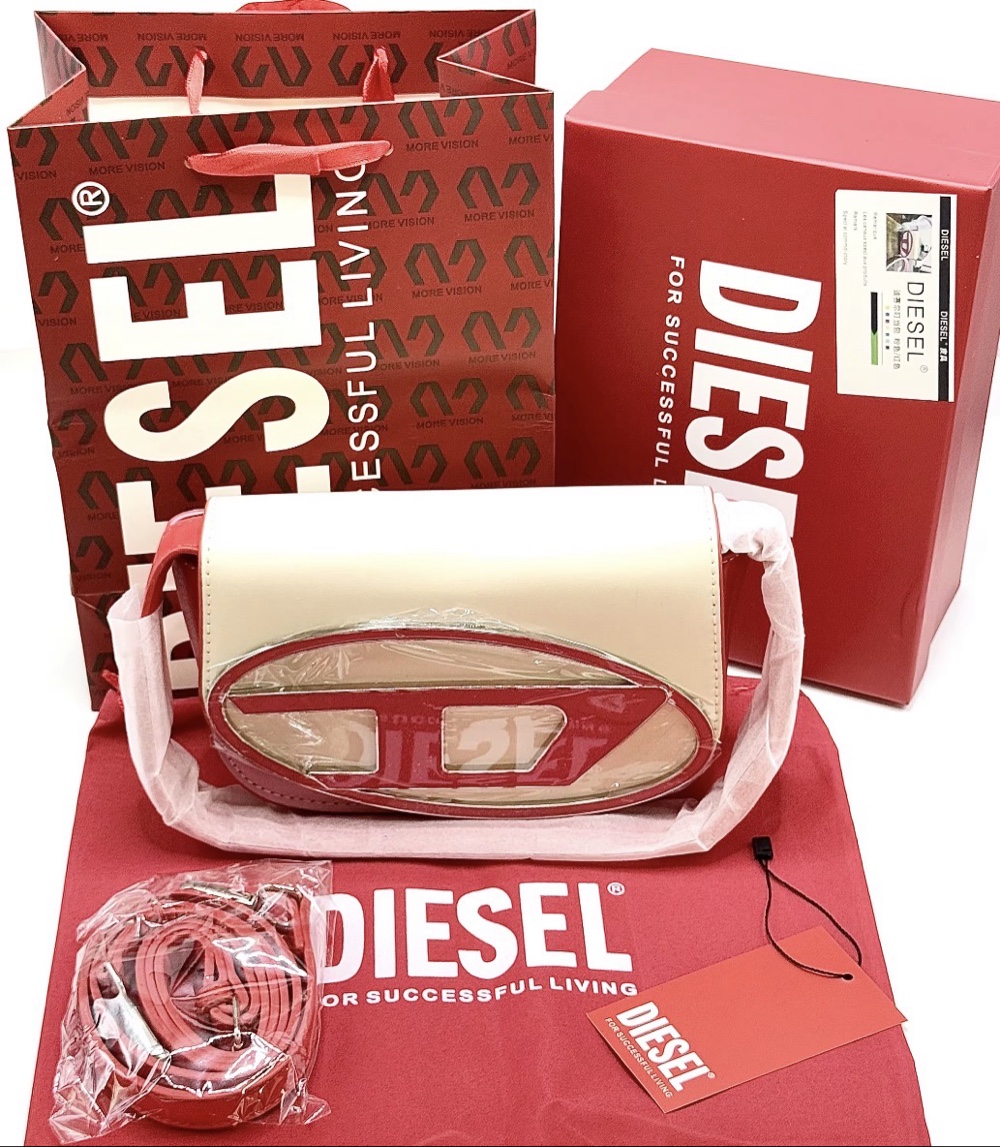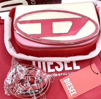 Diesel crossbody bag with a prominent logo plaque. Comes with a branded box, dust bag, and shoulder strap. Multicolored design.