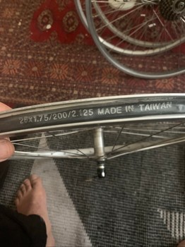 Silver-colored bicycle rim. Size 26x1.75/2.00/2.125, made in Taiwan.