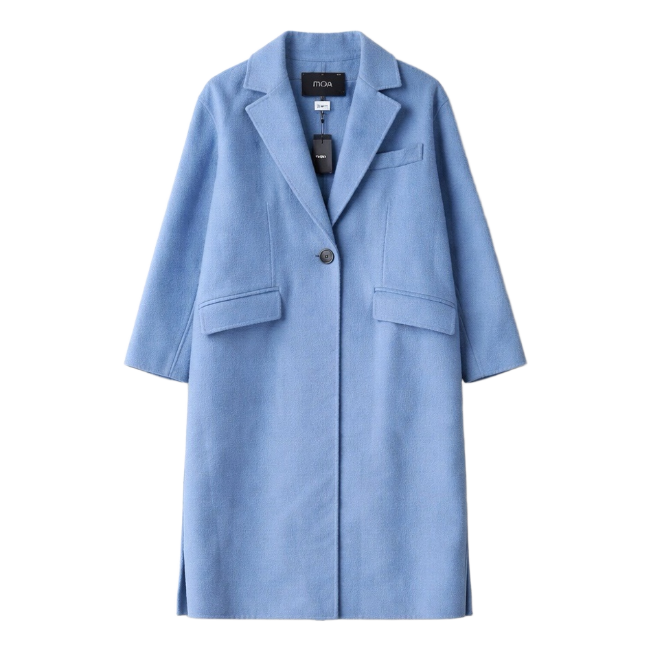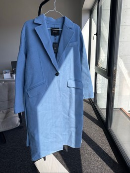 Single-button light blue wool blend coat. Featuring front flap pockets, back belt detail, and original tags attached. Size 40.