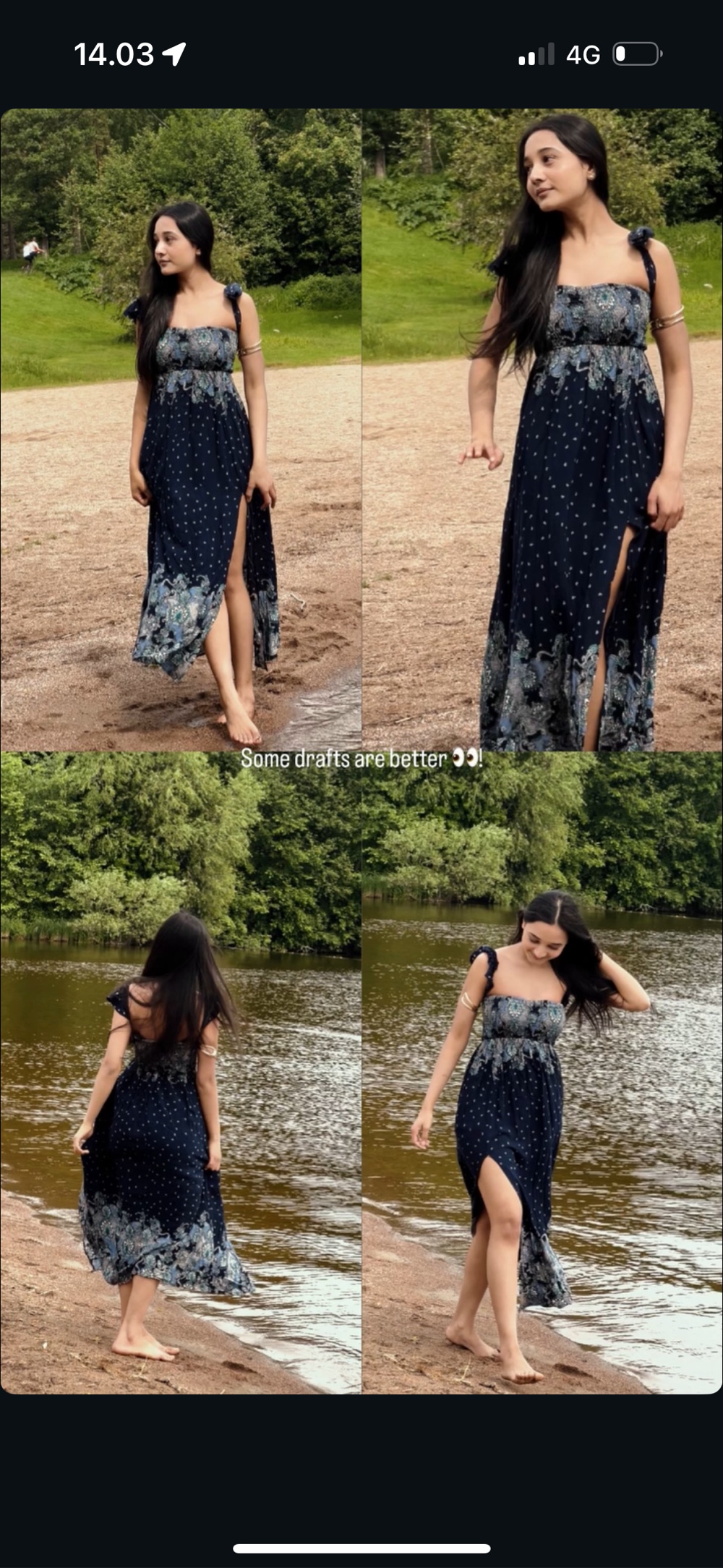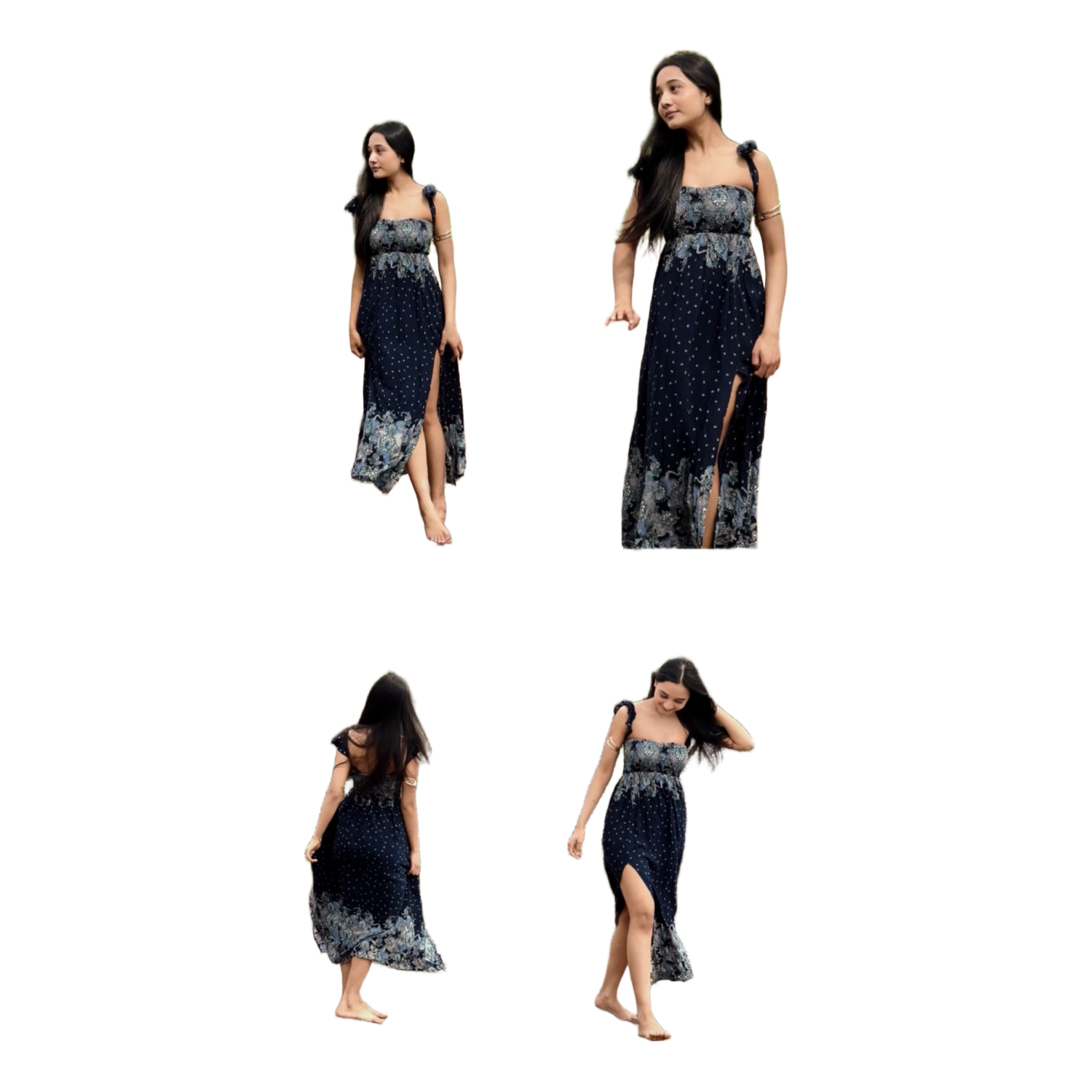 Maxi dress with a deep side slit and shoulder straps. Features a dark blue patterned design. It fits for small also since it’s stretchable
