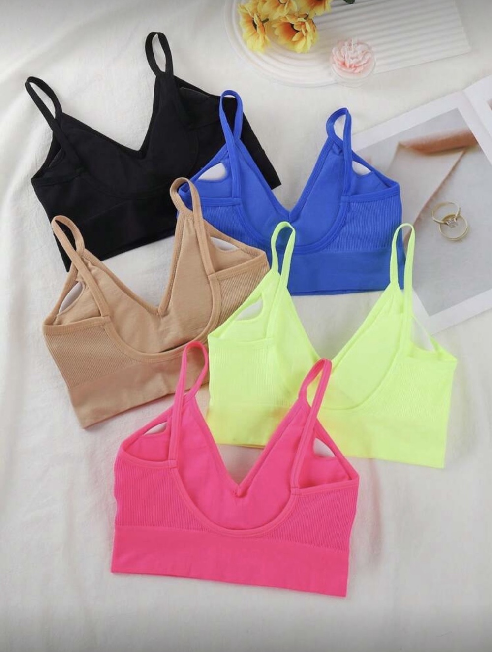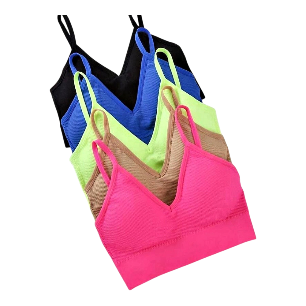 Set of five ribbed V-neck crop tops in assorted vibrant colors.