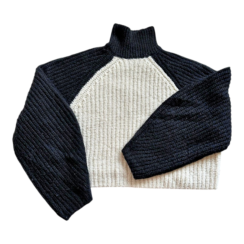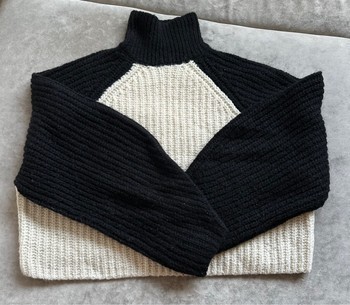 Knit sweater with a high collar, featuring a color-block design in black and white.