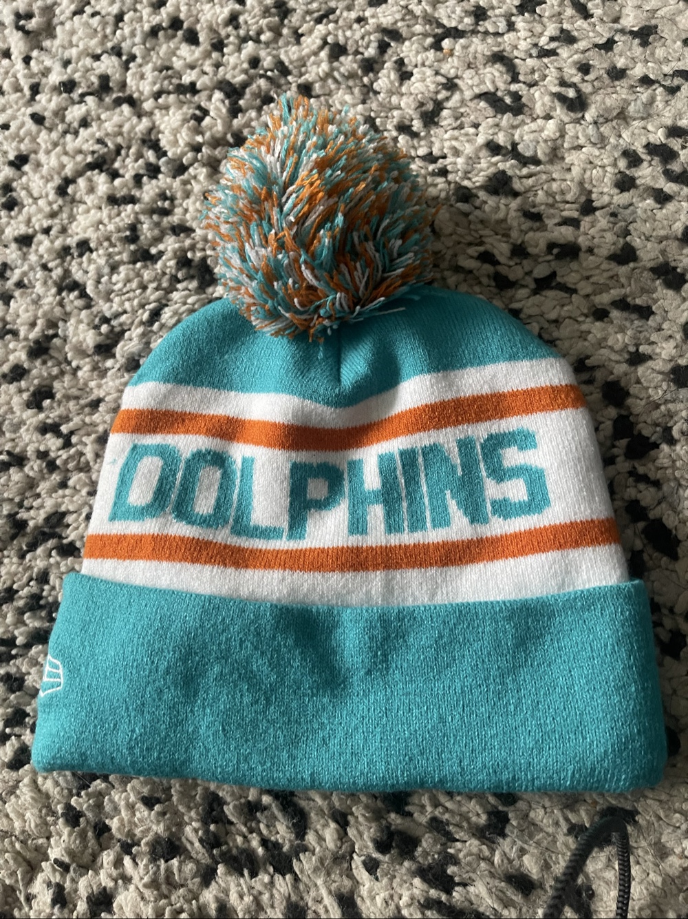 Turquoise Miami Dolphins beanie. Decorated with a pompom.