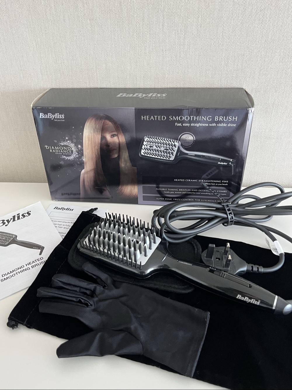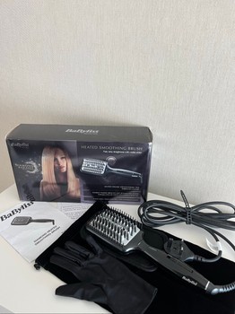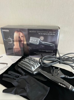 BaByliss diamond heated smoothing brush with box and protective glove. Includes ceramic straightening fins for smooth hair.